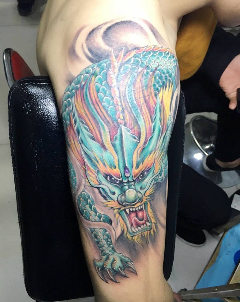 • T网红王老大花腿龙纹身图片_腿部新传统纹身图案