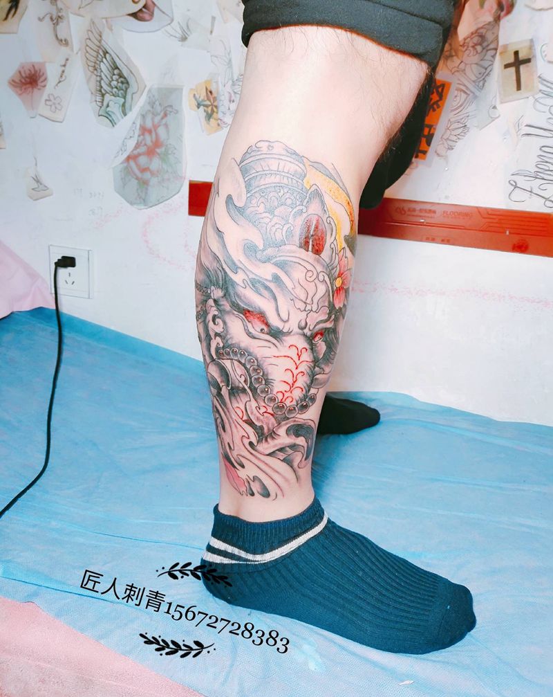 • T网红王老大花腿龙纹身图片_腿部新传统纹身图案
