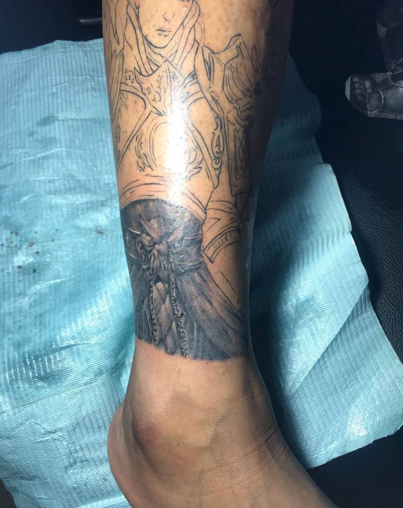 • T包小腿吹火男+阿多福纹身图片_腿部老传统新传统吹火男阿