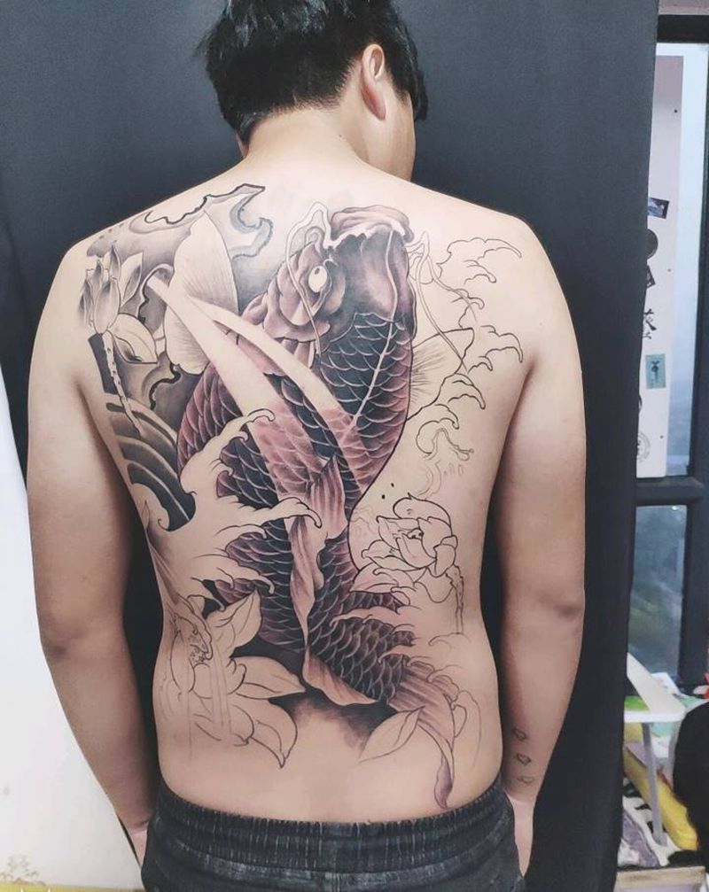 满背鲤鱼纹身图片_背部新传统纹身图案