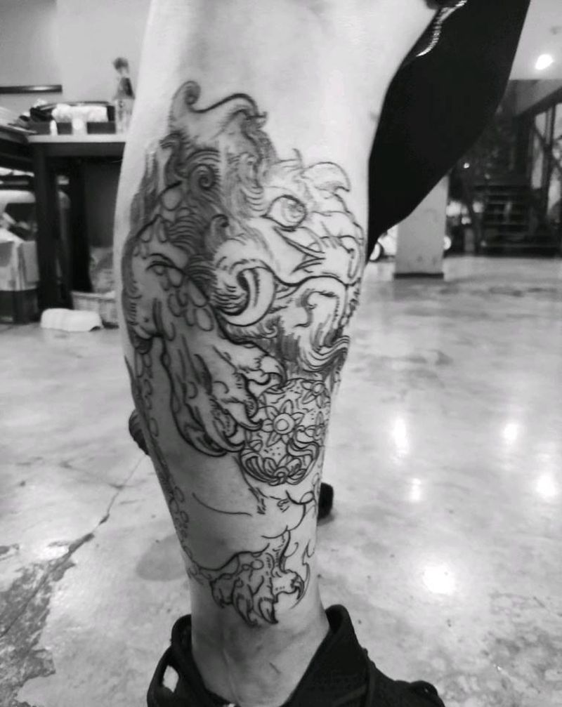 唐狮线条纹身图片_腿部纹身图案
