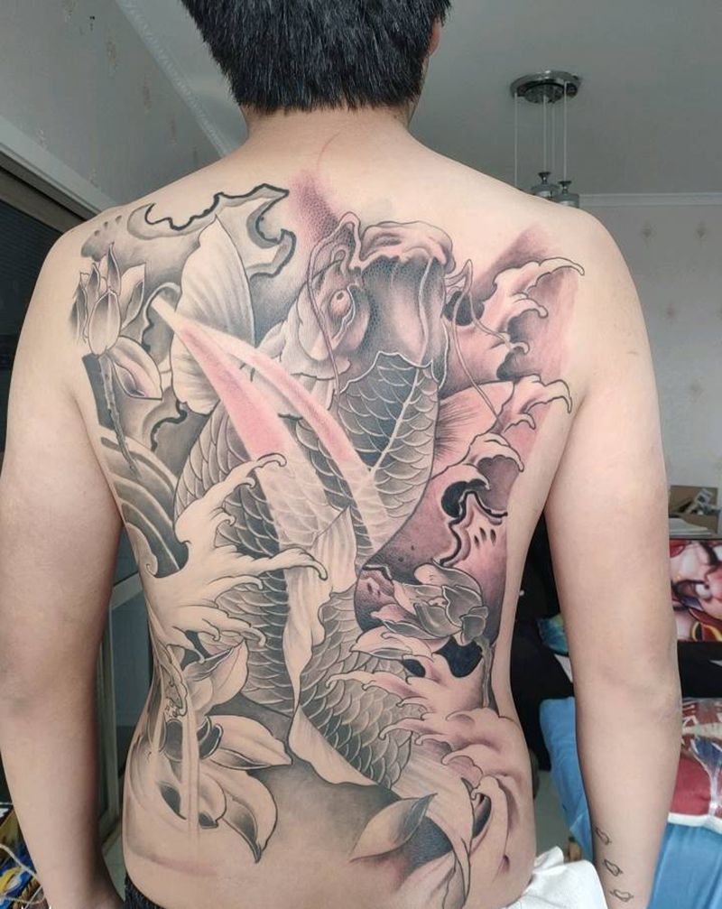 当前位置: 首页 >河南省南阳市纹身店-南阳·鸿蒙纹身纹身图案>满背鲤鱼纹身图片_背部新传统鲤鱼纹身图案