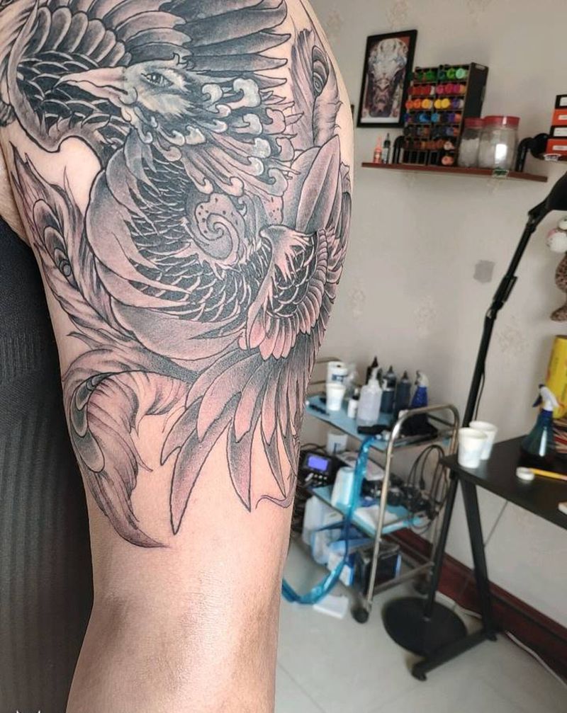 大臂凤凰。遮盖纹身图片_手臂新传统凤凰纹身图案