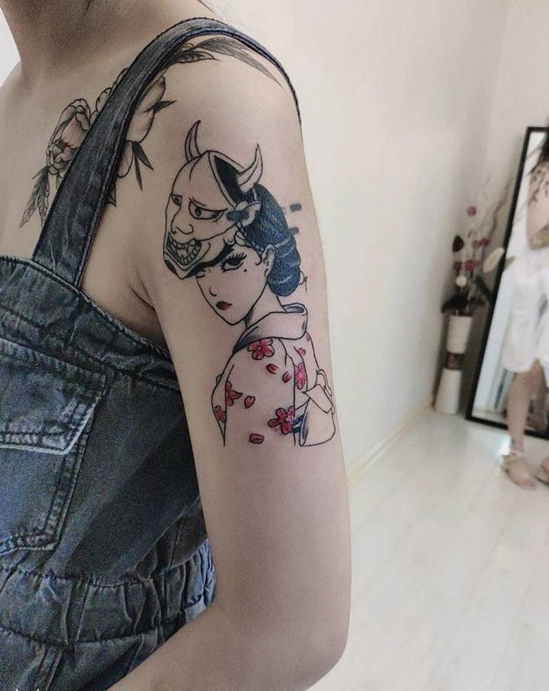 面具美女纹身图片_手臂新传统纹身图案