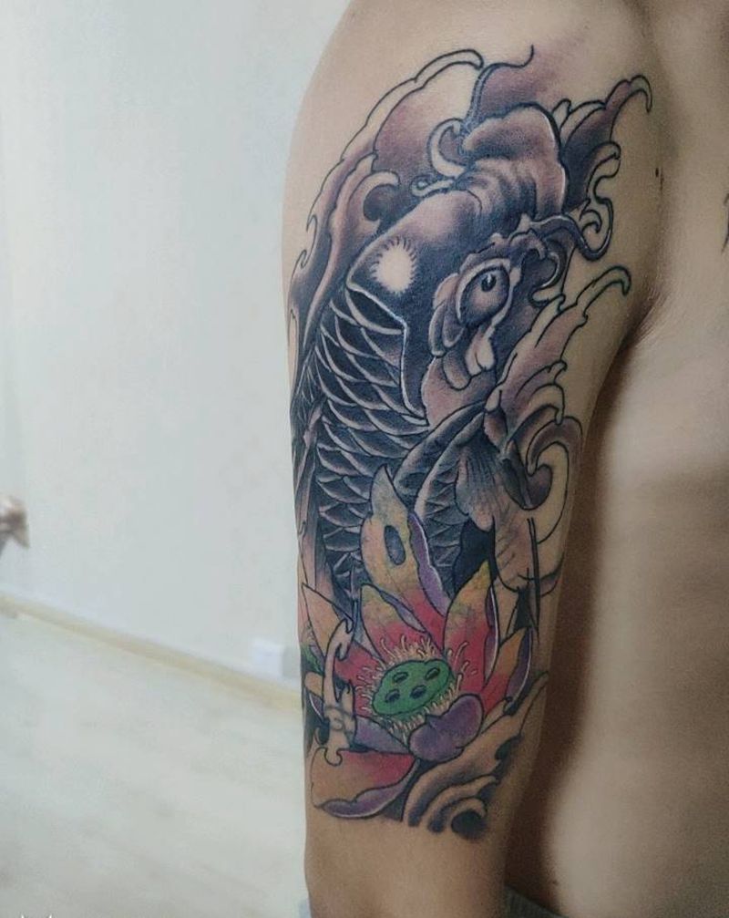 鲤鱼遮盖龙头纹身图片_手臂新传统纹身图案