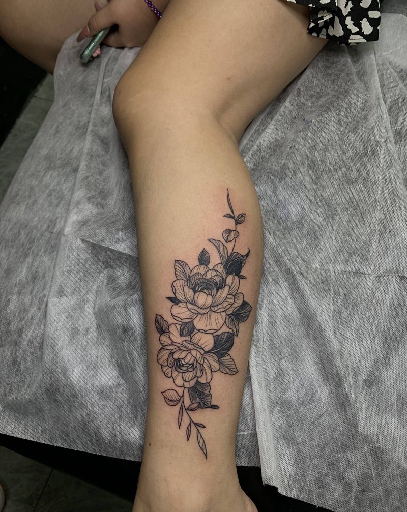 当前位置: 首页 >河南省南阳市纹身店-神雕刺青纹身图案>素花纹身图片_腿部点刺素花纹身图案