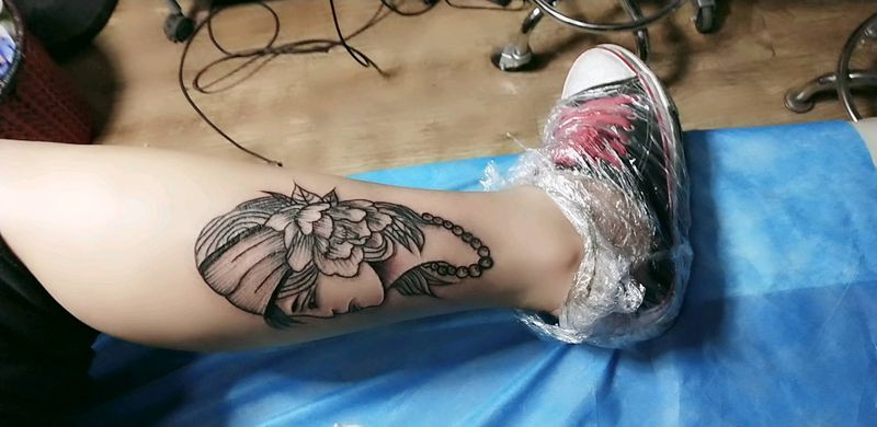 • T包小腿吹火男+阿多福纹身图片_腿部老传统新传统吹火男阿