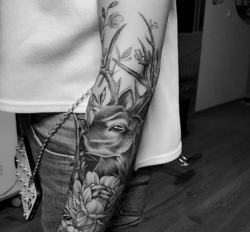 小臂素花鹿纹身图片_手臂欧美写实点刺素花鹿纹身图案
