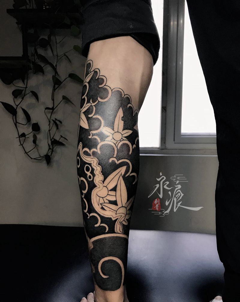 当前位置: 首页 >河南省信阳市纹身店-永痕刺青纹身图案>日式包小腿纹身图片_腿部老传统泡泡云枫叶包小腿纹身图案