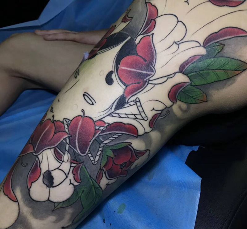 • T网红王老大花腿龙纹身图片_腿部新传统纹身图案