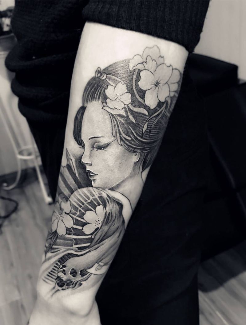 小臂艺伎纹身纹身图片_成品手臂传统肖像人物纹身图案