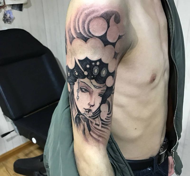 当前位置: 首页 >河南省信阳市纹身店-永痕刺青纹身图案>大臂花旦纹身图片_成品手臂传统肖像人物唯美纹身图案