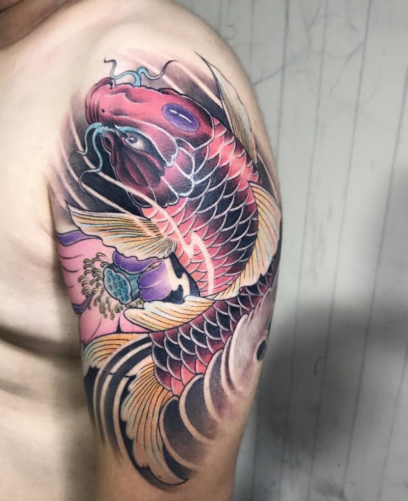 当前位置: 首页 >河南省信阳市纹身店-永痕刺青纹身图案>鲤鱼纹身图片_成品手臂传统动物植物纹身图案