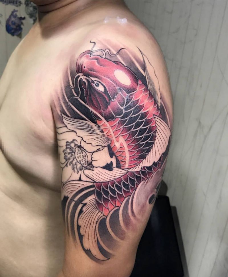 当前位置: 首页 >河南省信阳市纹身店-永痕刺青纹身图案>鲤鱼纹身图片_成品手臂传统动物植物纹身图案