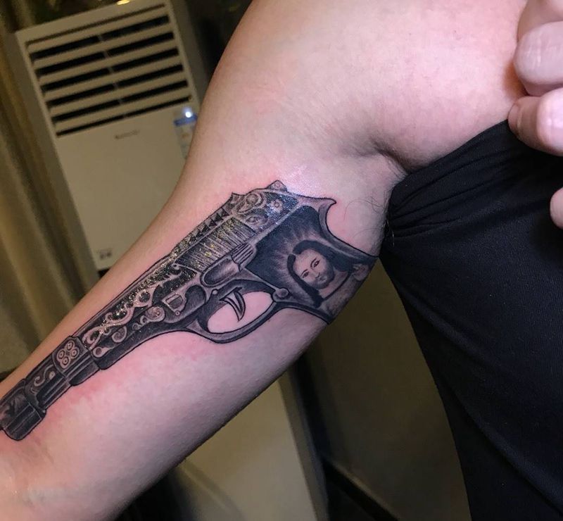 手枪纹身图片_成品手臂欧美写实人物宗教手部纹身图案