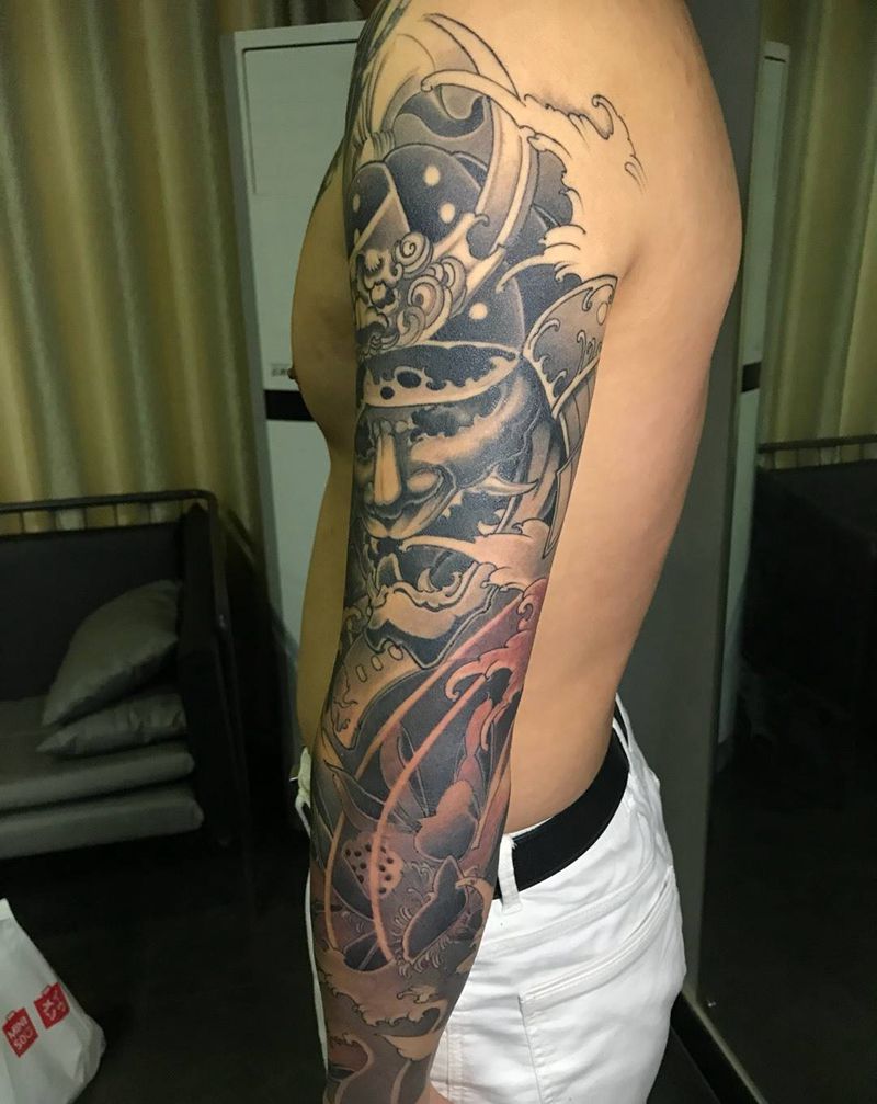武士花臂纹身图片_成品手臂传统动物植物鬼神肖像纹身图案