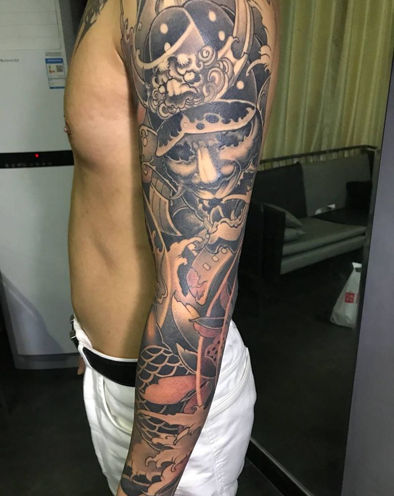 武士花臂纹身图片_成品手臂传统动物植物鬼神肖像纹身图案
