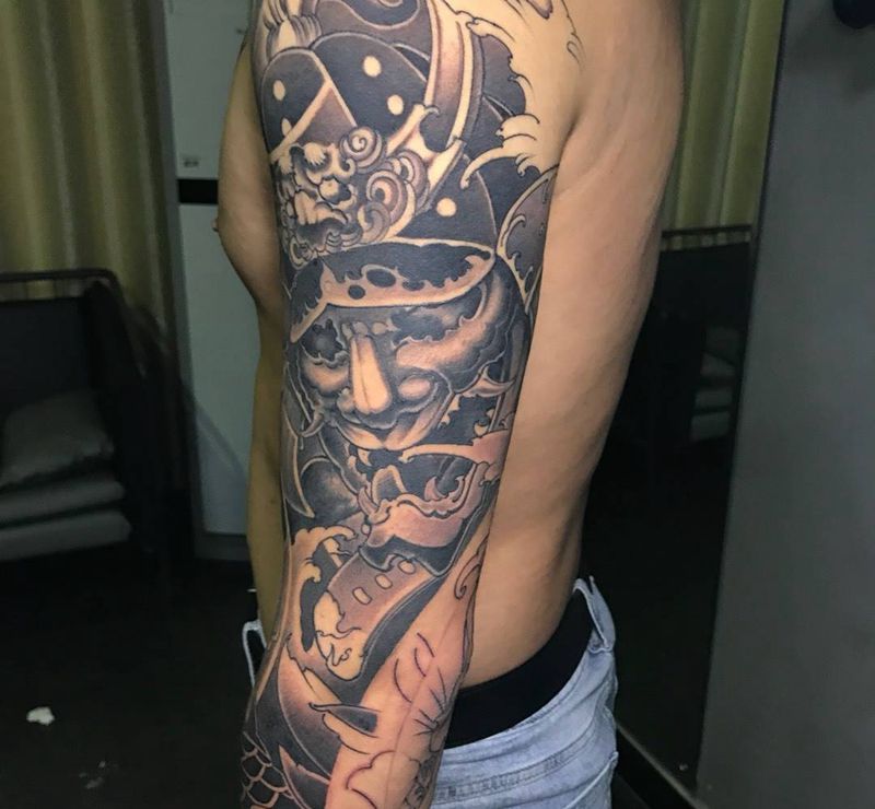 武士花臂(还未完成)纹身图片_成品肖像传统手臂人物鬼神动物植物纹身图案