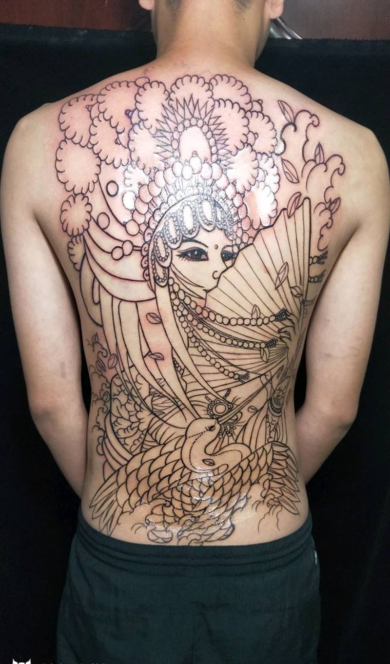 满背花旦纹身图片_背部新传统花旦纹身图案