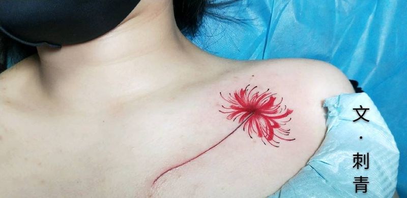 彼岸花纹身图片_肩部胸部水彩纹身图案