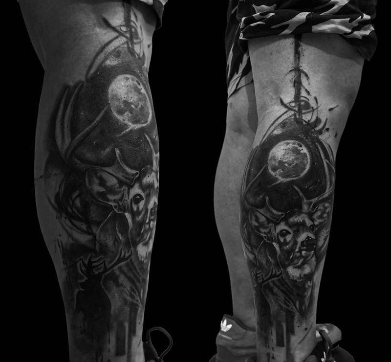 • T网红王老大花腿龙纹身图片_腿部新传统纹身图案