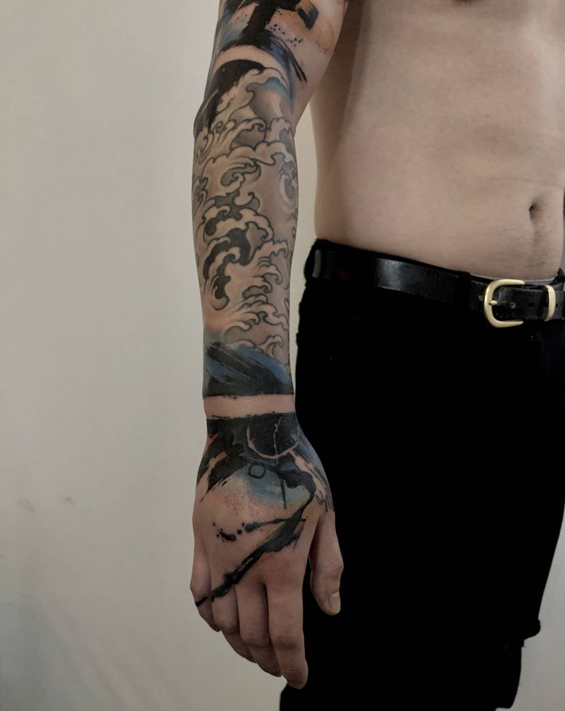 抽象泼墨花臂纹身图片_手部手臂水墨纹身图案