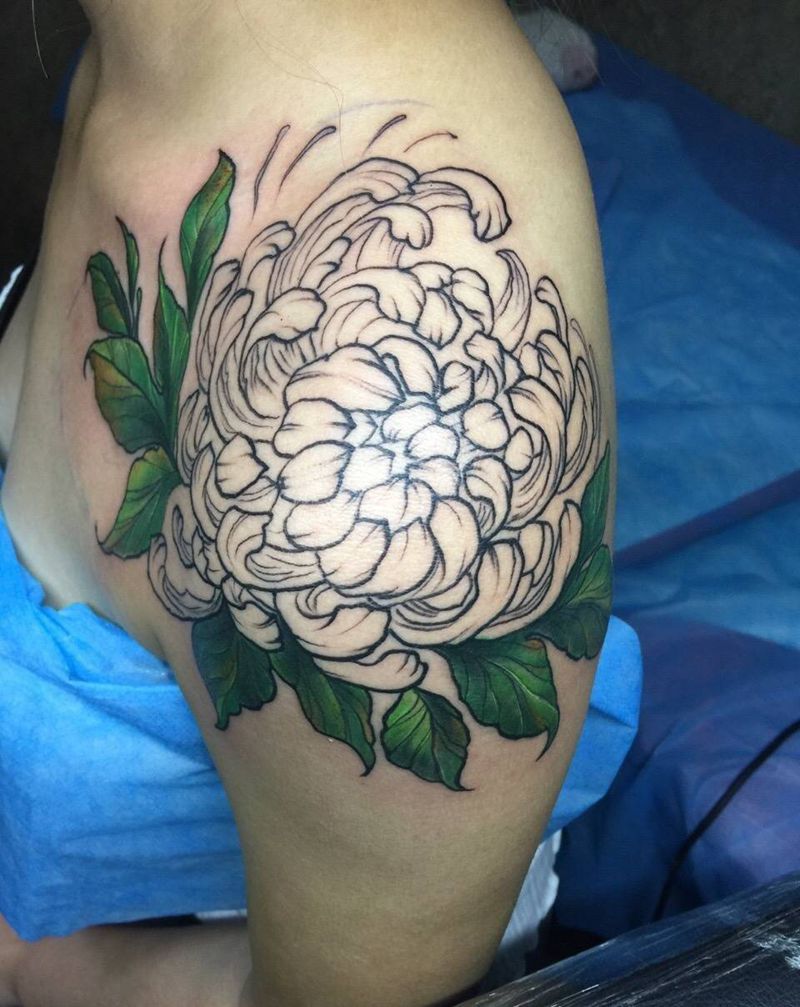 当前位置: 首页 >河南省驻马店市纹身店-墨绣堂刺青工作室纹身图案>肩头菊花纹身图片