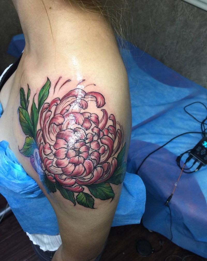 当前位置: 首页 >河南省驻马店市纹身店-墨绣堂刺青工作室纹身图案>肩头菊花纹身图片