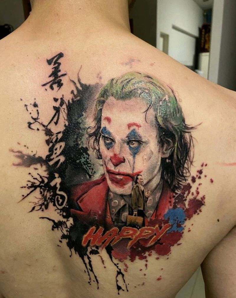 当前位置: 首页 >湖北省武汉市纹身店-武汉南都刺青纹身工作室纹身图案>小丑纹身图片_肩部背部欧美写实水彩小丑水彩泼墨纹身图案