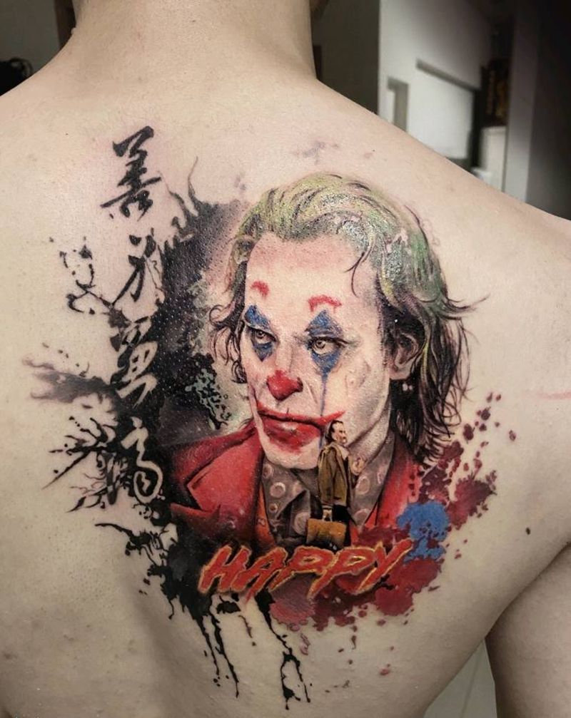 小丑纹身图片_肩部背部欧美写实水彩小丑水彩泼墨纹身图案