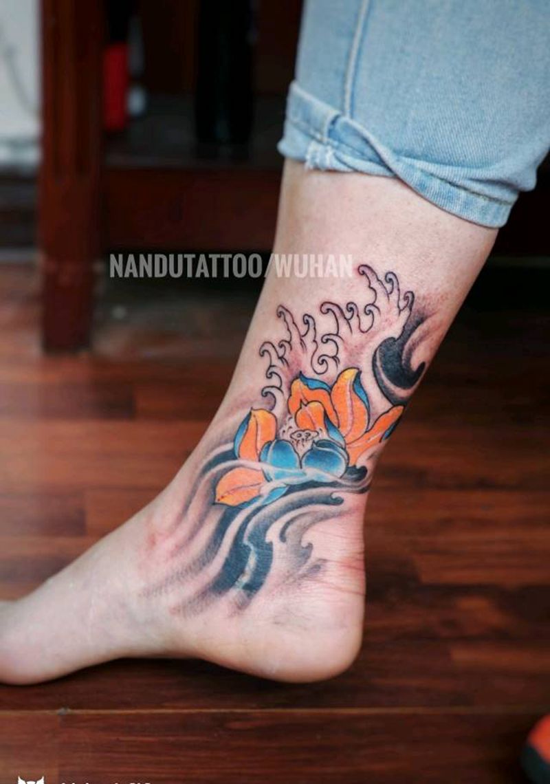 荷花纹身图片_腿部脚部传统国画原创武汉成品纹身图案