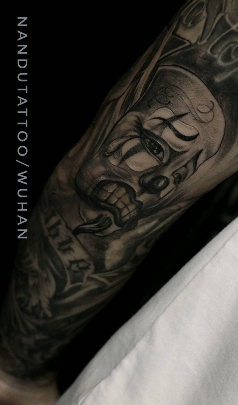 当前位置: 首页 >湖北省武汉市纹身店-武汉南都刺青纹身工作室纹身图案>苦笑面具纹身图片_手臂手部欧美肖像写实人物宗教武汉纹身图案