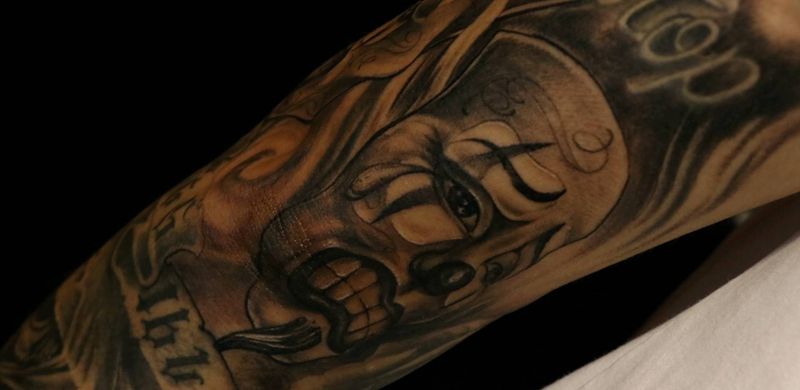 当前位置: 首页 >湖北省武汉市纹身店-武汉南都刺青纹身工作室纹身图案>苦笑面具纹身图片_手臂手部欧美肖像写实人物宗教武汉纹身图案