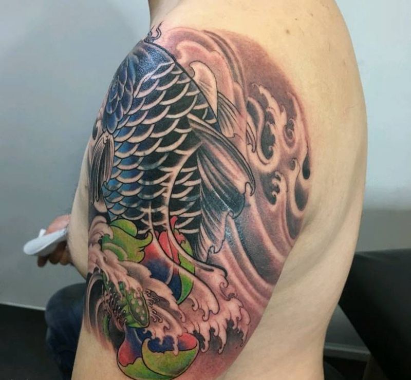 当前位置: 首页 >湖北省武汉市纹身店-武汉南都刺青纹身工作室纹身图案>鲤鱼遮盖纹身图片_肩部手臂新传统鱼浪花传统纹身图案