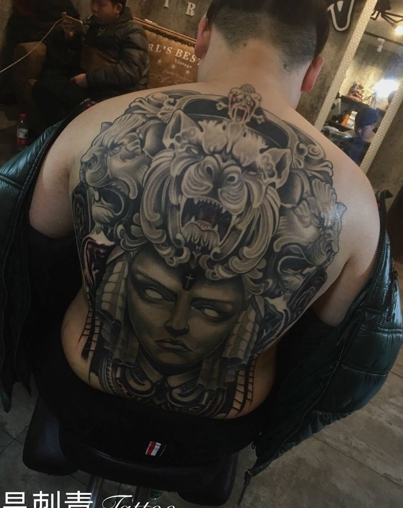 满背狮子女郎纹身图片_成品背部欧美动物鬼神人物写实纹身图案