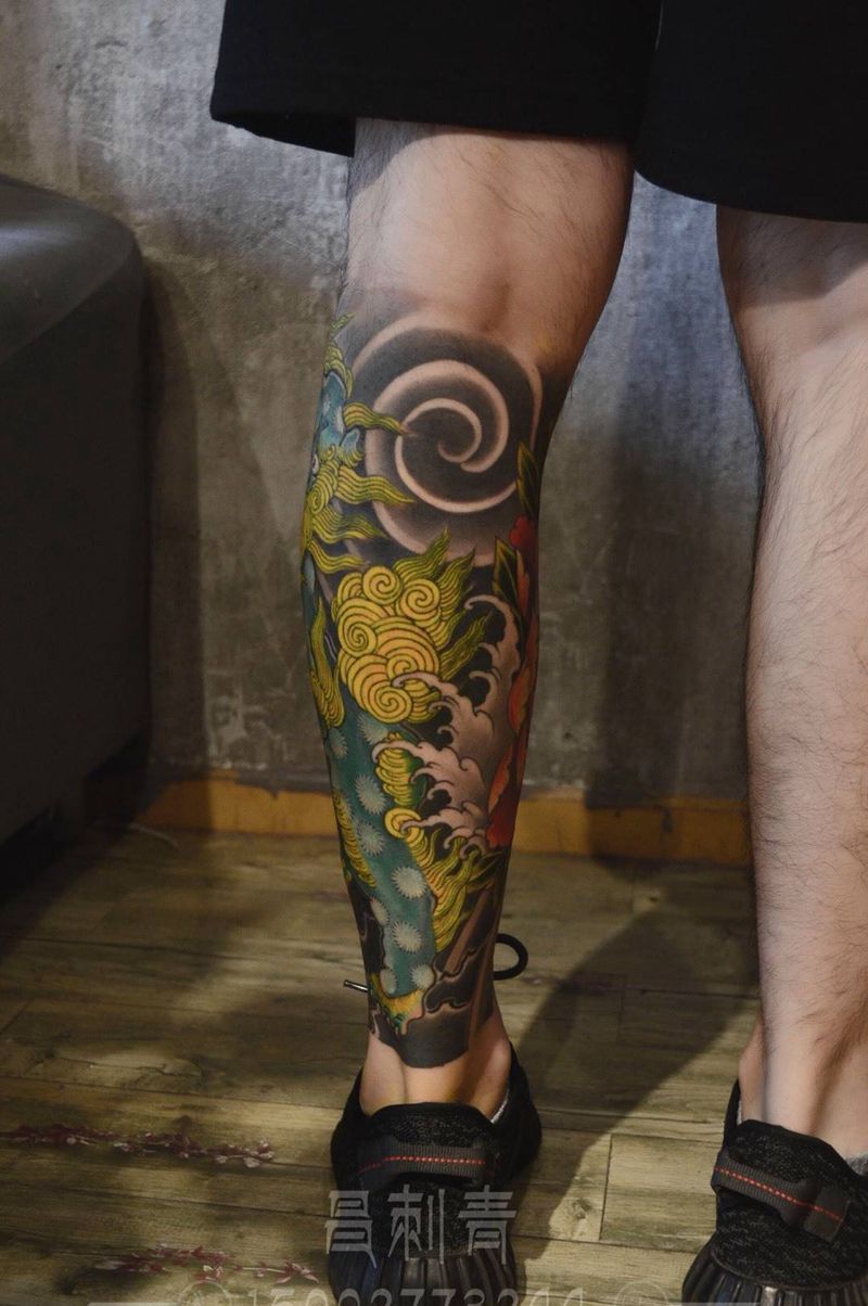 小腿唐狮子牡丹纹身图片_成品腿部脚部传统动物鬼神原创静物植物纹身图案