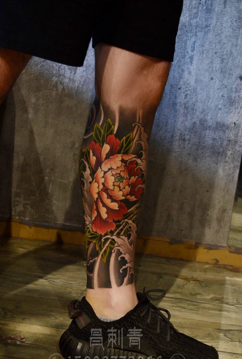 小腿唐狮子牡丹纹身图片_成品腿部脚部传统动物鬼神原创静物植物纹身图案