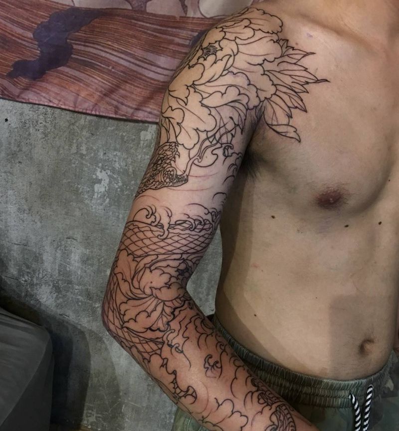 当前位置: 首页 >湖北省武汉市纹身店-昌刺青纹身图案>蛇牡丹花臂线条完成纹身图片