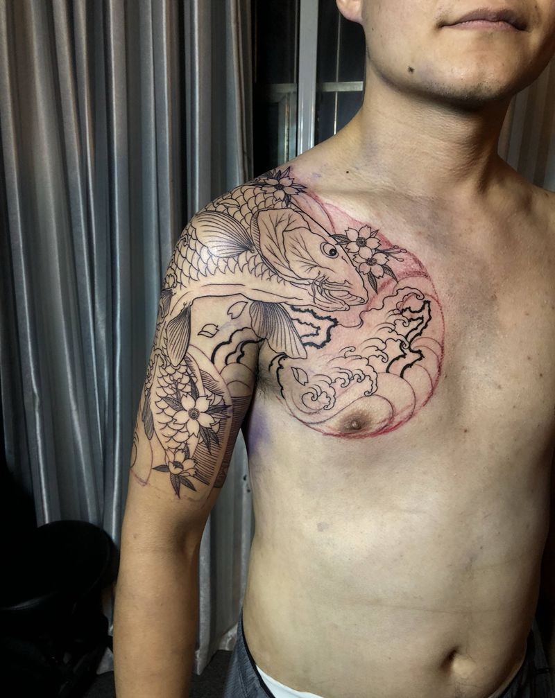 半甲鲤鱼未完待续纹身图片_胸部手部新传统纹身图案