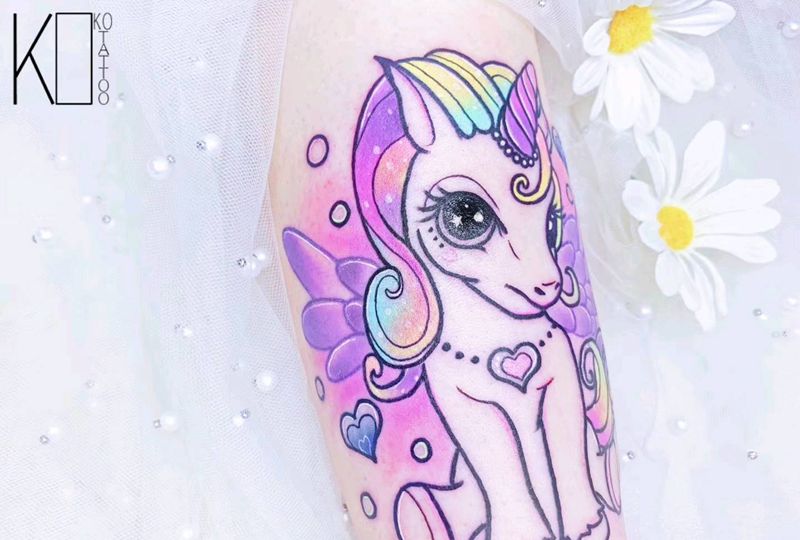 当前位置: 首页 >湖北省武汉市纹身店-KOKO TATTOO原创定制纹身店纹身图案>马卡龙独角兽纹身图片_手臂水彩New School天马泡泡水彩纹身图案