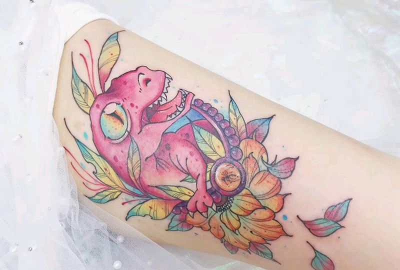 当前位置: 首页 >湖北省武汉市纹身店-KOKO TATTOO原创定制纹身店纹身图案>霸王龙纹身图片_腿部水彩霸王龙花宝石纹身图案
