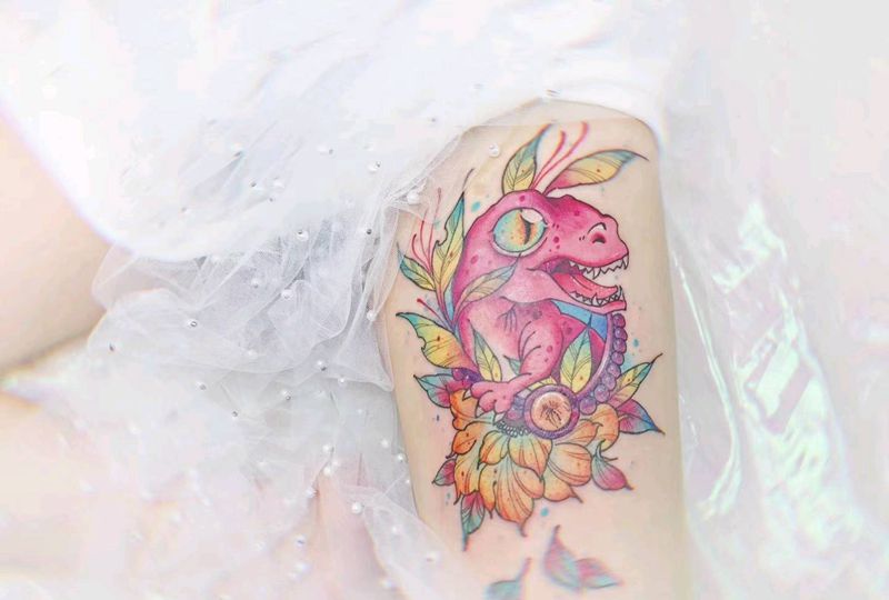 当前位置: 首页 >湖北省武汉市纹身店-KOKO TATTOO原创定制纹身店纹身图案>霸王龙纹身图片_腿部水彩霸王龙花宝石纹身图案