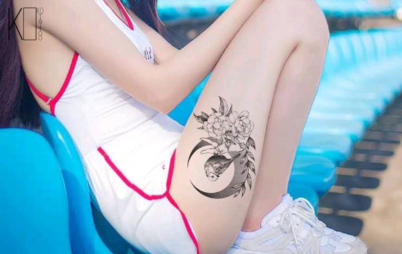 驻足纹身图片_腿部手臂点刺小鸟月亮小清新纹身图案
