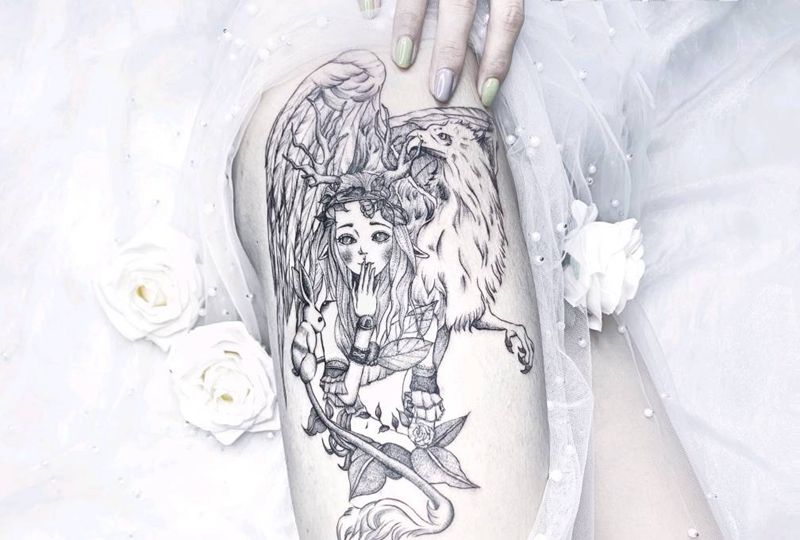 当前位置: 首页 >湖北省武汉市纹身店-KOKO TATTOO原创定制纹身店纹身图案>森之精灵纹身图片_腿部点刺狮鹫精灵插画纹身图案
