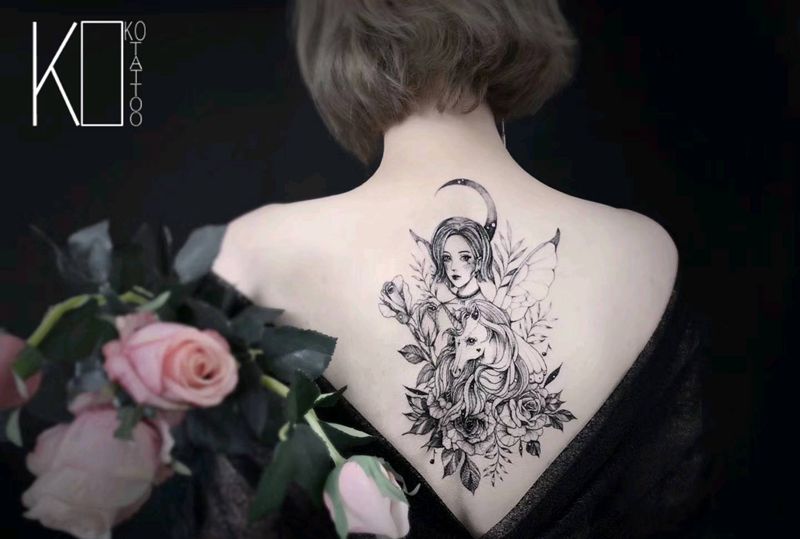 肖像设计纹身图片_背部点刺肖像独角兽花卉纹身图案