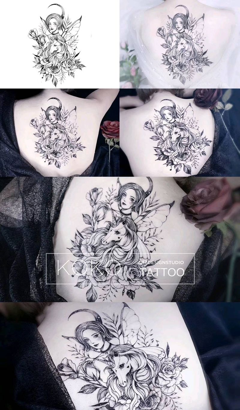 肖像设计纹身图片_背部点刺肖像独角兽花卉纹身图案
