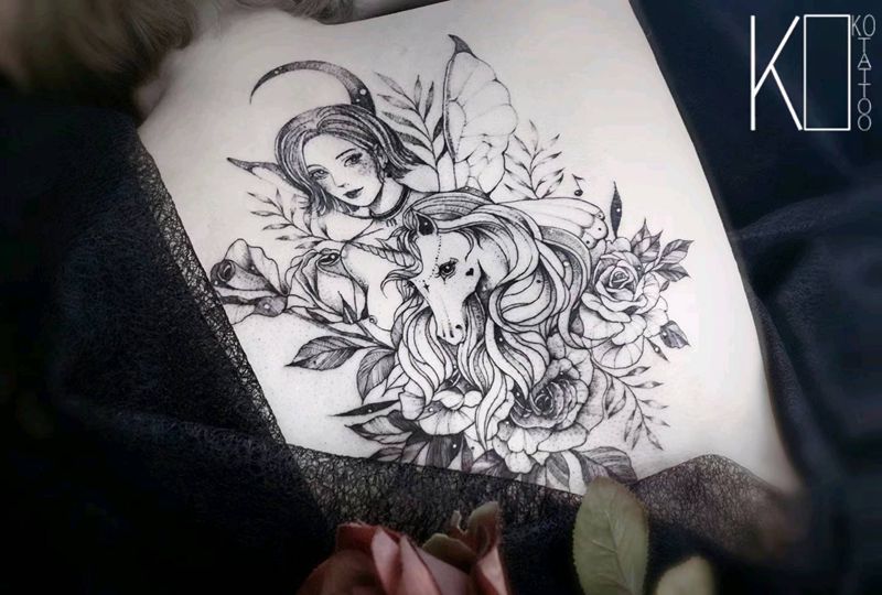 肖像设计纹身图片_背部点刺肖像独角兽花卉纹身图案