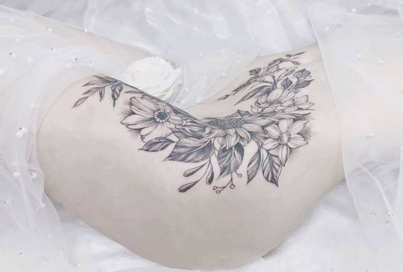 针痕花卉纹身图片_腿部点刺花卉针痕大腿纹身图案