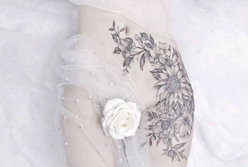 针痕花卉纹身图片_腿部点刺花卉针痕大腿纹身图案