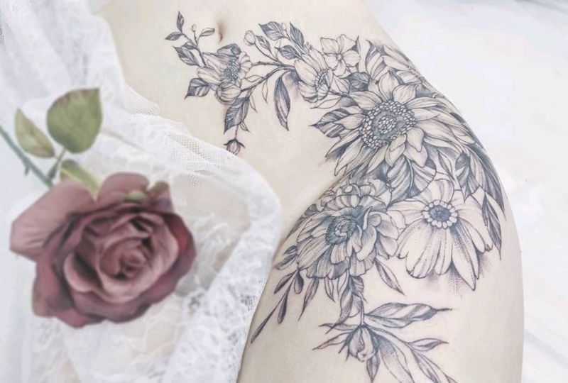 针痕花卉纹身图片_腿部点刺花卉针痕大腿纹身图案